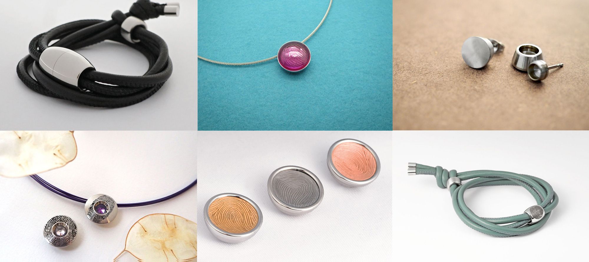 Besonders beliebt ist der Fingerprint. Dabei wird ein Fingerabdruck des Verstorbenen in ein Schmuckstück aus Gold, Silber oder Weißgold eingearbeitet. Der Fingerabdruck kann beispielsweise als Ring, Anhänger, Ohrstecker oder als Manschettenknöpfe getragen werden. Darüber hinaus kann auch ein kleiner Teil der Asche des Verstorbenen für ein Schmuckstück verwendet werden, zum Beispiel in Form eines Anhängers. Die Asche wird in den Anhänger eingearbeitet oder in dessen Kammer gefüllt.